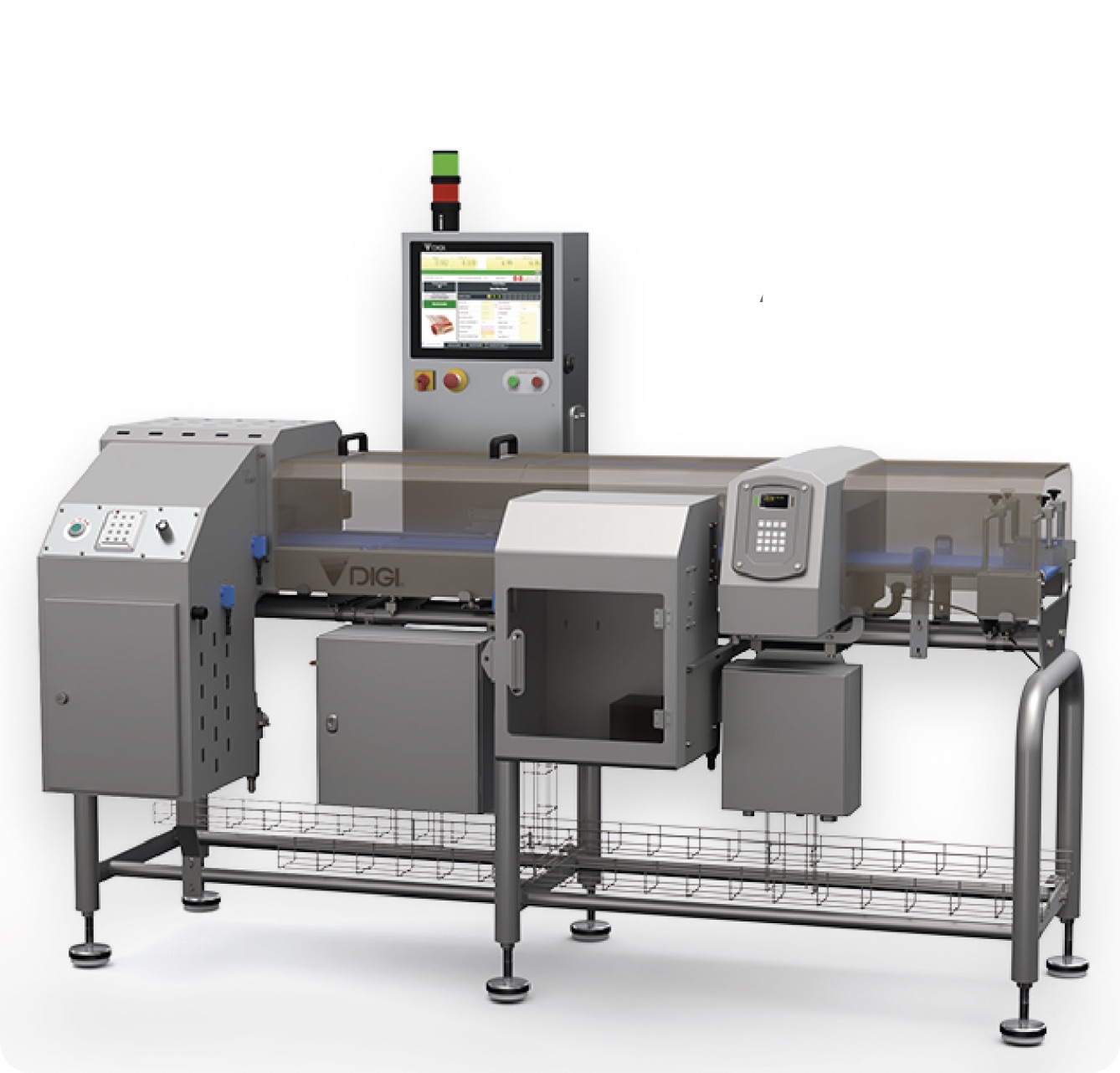 Το DIGI CW-800 Combi είναι ένα αυτόματο σύστημα checkweighing με metal detection και rejection, σχεδιασμένο για ολοκληρωμένο ποιοτικό έλεγχο στη βιομηχανία τροφίμων. Συνδυάζει έλεγχο βάρους έως 150 συσκευασίες ανά λεπτό, ανίχνευση μετάλλων, ενσωματωμένο rejector, έγχρωμη οθόνη αφής 15″ και δυνατότητες διασύνδεσης με back-office συστήματα για αποδοτική και οργανωμένη λειτουργία στη γραμμή παραγωγής.